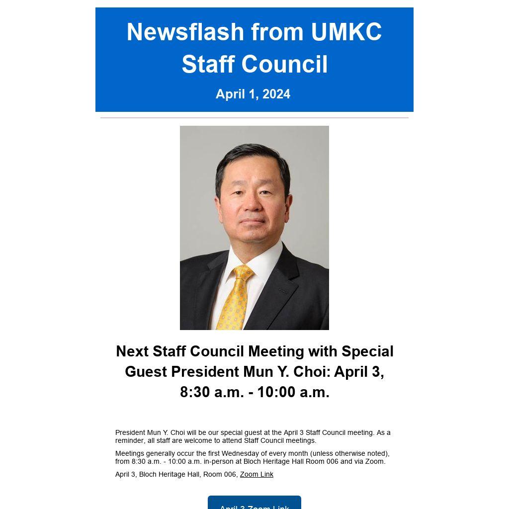 Next Staff Council Meeting with Special Guest President Mun Y. Choi: April 3, 8:30 a.m. - 10:00 a.m.