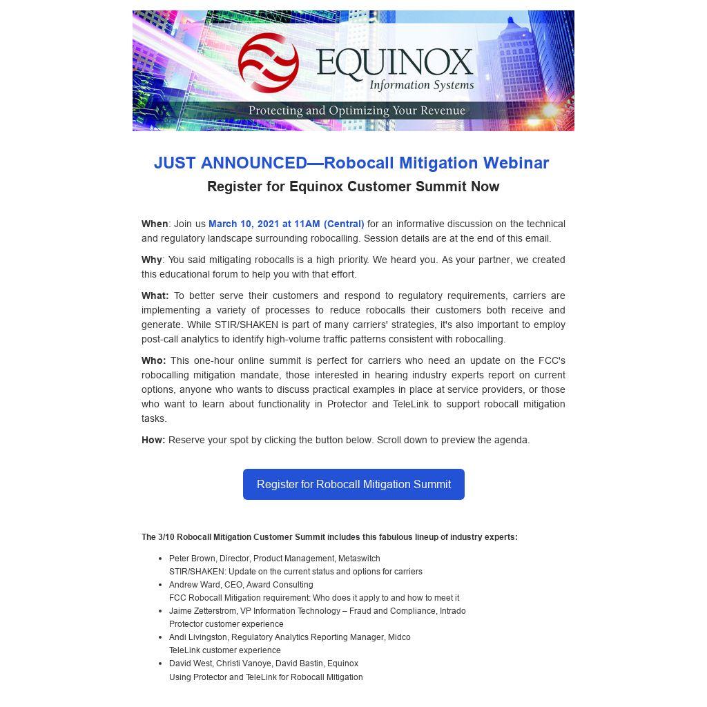 When: Join us March 10, 2021 at 11AM (Central) for an informative discussion on the technical and regulatory landscape surrounding robocalling. Session details are at the end of this email.