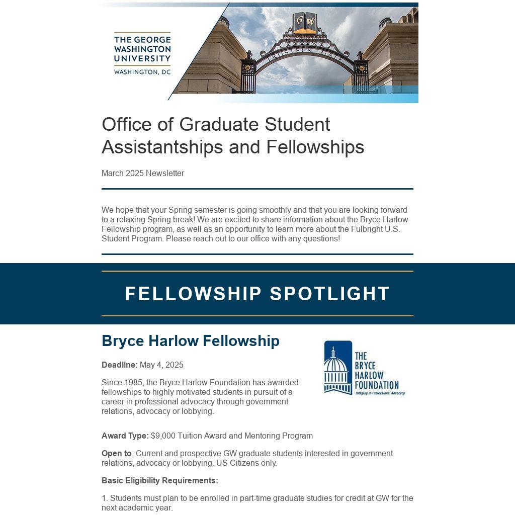 We hope that your Spring semester is going smoothly and that you are looking forward to a relaxing Spring break! We are excited to share information about the Bryce Harlow Fellowship program, as well as an opportunity to learn more about the Fulbright U.S. Student Program. Please reach out to our office with any questions!