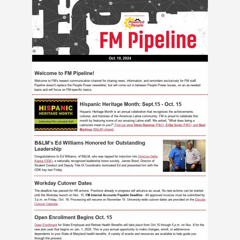 Welcome to FM's newest communication channel for sharing news, information, and reminders exclusively for FM staff. Pipeline doesn't replace the People Power newsletter, but will come out in between People Power issues, on an as-needed basis and will focus on FM-specific topics.
