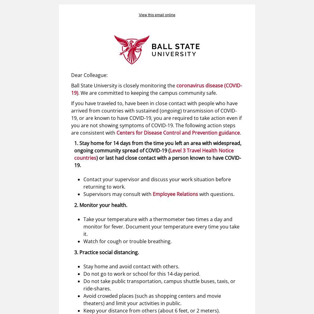 Ball State University is closely monitoring the coronavirus disease (COVID-19). We are committed to keeping the campus community safe.
