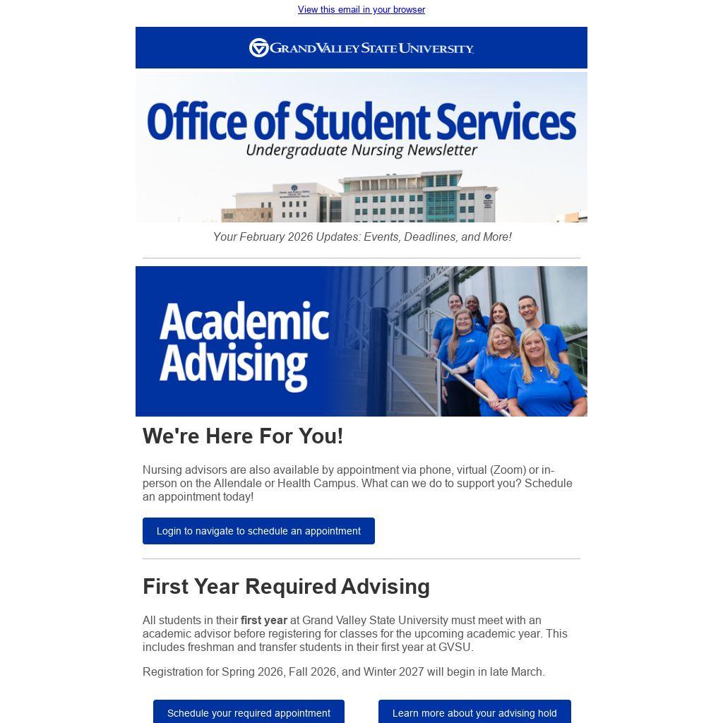 All students in their first year at Grand Valley State University must meet with an academic advisor before registering for classes for the upcoming academic year. This includes freshman and transfer students in their first year at GVSU.