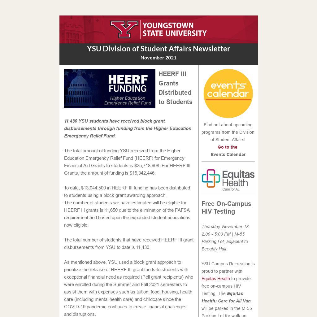 In addition to HEERF III Grant awarding, YSU has been conducting direct outreach to financial aid applicants about the opportunity to receive a financial aid adjustment due to the recent unemployment of a family member or independent student, or other circumstances. Communications to students using targeted emails, the Office of Financial Aid and Scholarships Dollars and Sense newsletter, the Division of Student Affairs - The Pulse newsletter, and with post cards mailed to their homes. The financial aid special circumstance review message expresses the following: If you, or your family, have experienced a financial hardship during the calendar year 2020, or 2021, please contact the Office of Financial Aid and Scholarships to discuss a potential reassessment of your federal and state grant aid eligibility.