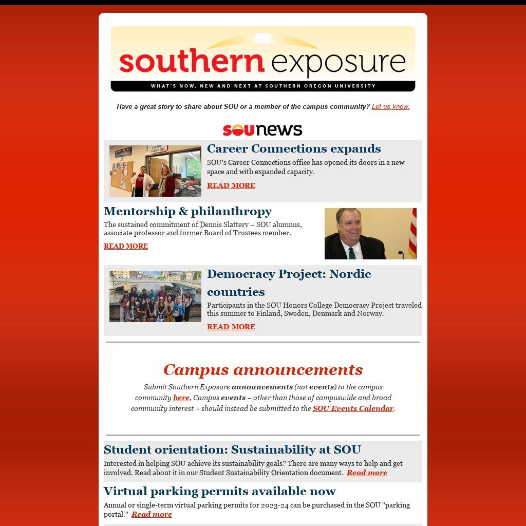 Submit Southern Exposure announcements (not events) to the campus community here. Campus events – other than those of campuswide and broad community interest – should instead be submitted to the SOU Events Calendar.