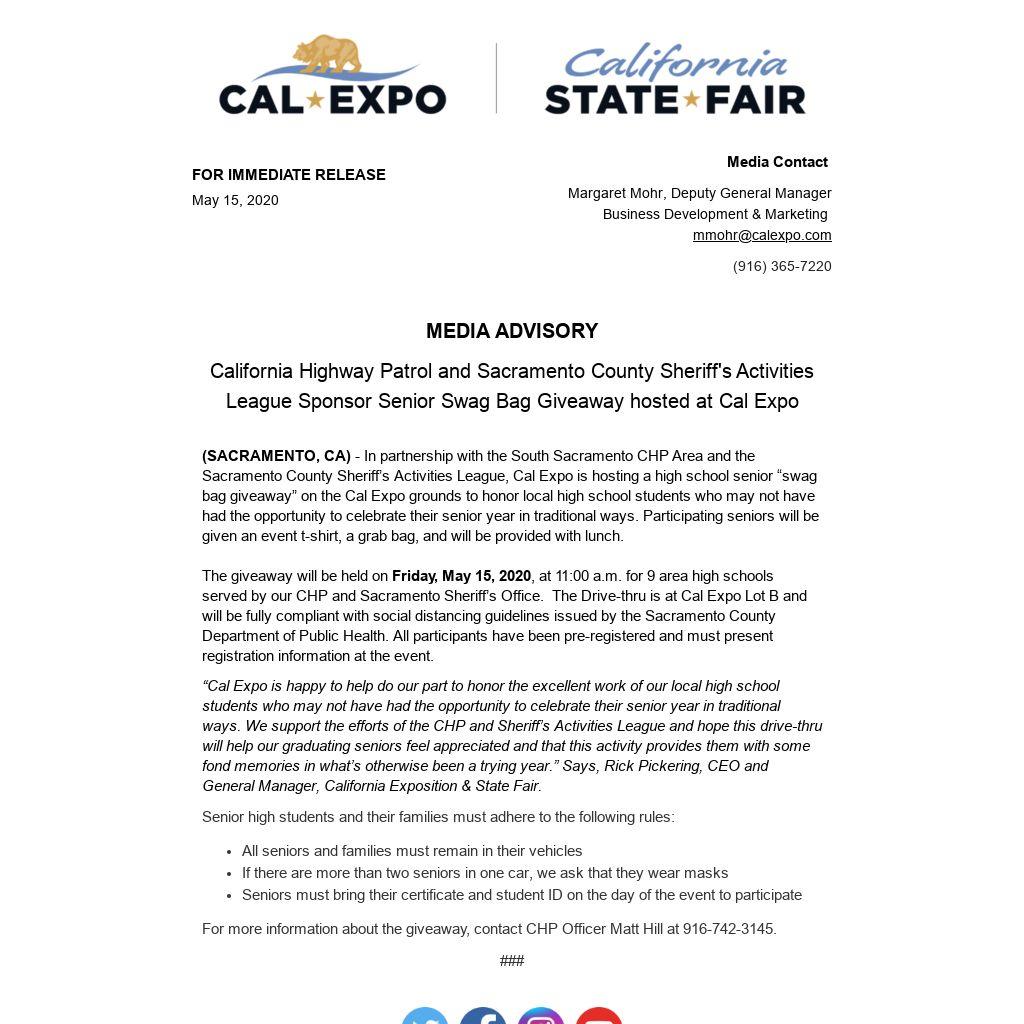 (SACRAMENTO, CA) - In partnership with the South Sacramento CHP Area and the Sacramento County Sheriff’s Activities League, Cal Expo is hosting a high school senior “swag bag giveaway” on the Cal Expo grounds to honor local high school students who may not have had the opportunity to celebrate their senior year in traditional ways. Participating seniors will be given an event t-shirt, a grab bag, and will be provided with lunch.