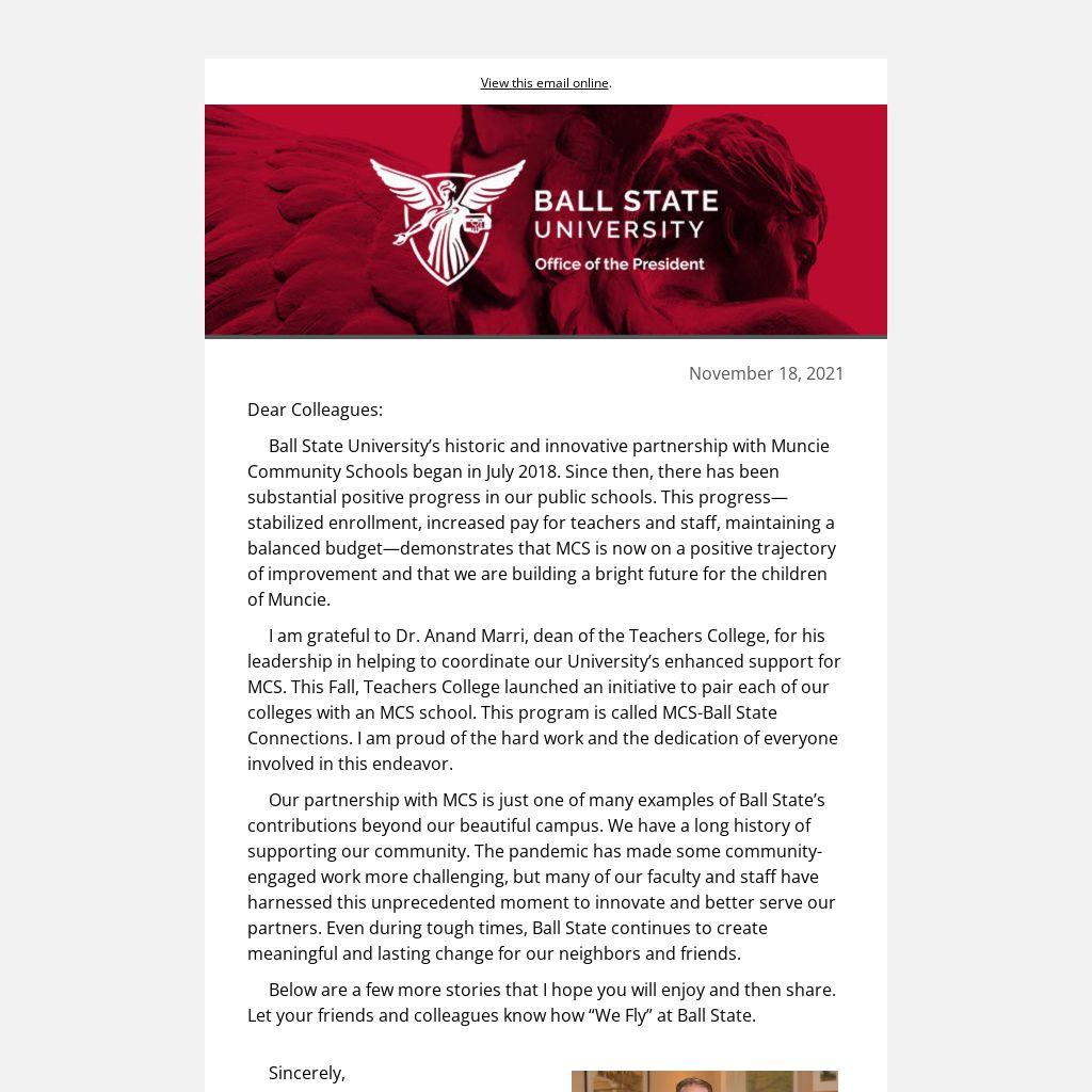 I am grateful to Dr. Anand Marri, dean of the Teachers College, for his leadership in helping to coordinate our University’s enhanced support for MCS. This Fall, Teachers College launched an initiative to pair each of our colleges with an MCS school. This program is called MCS-Ball State Connections. I am proud of the hard work and the dedication of everyone involved in this endeavor.