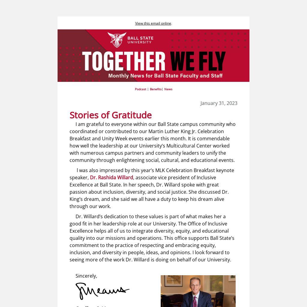 I am grateful to everyone within our Ball State campus community who coordinated or contributed to our Martin Luther King Jr. Celebration Breakfast and Unity Week events earlier this month. It is commendable how well the leadership at our University’s Multicultural Center worked with numerous campus partners and community leaders to unify the community through enlightening social, cultural, and educational events.