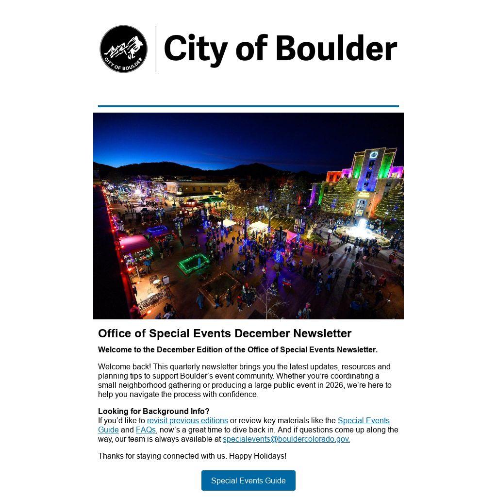 If you’d like to revisit previous editions or review key materials like the Special Events Guide and FAQs, now’s a great time to dive back in. And if questions come up along the way, our team is always available at specialevents@bouldercolorado.gov.