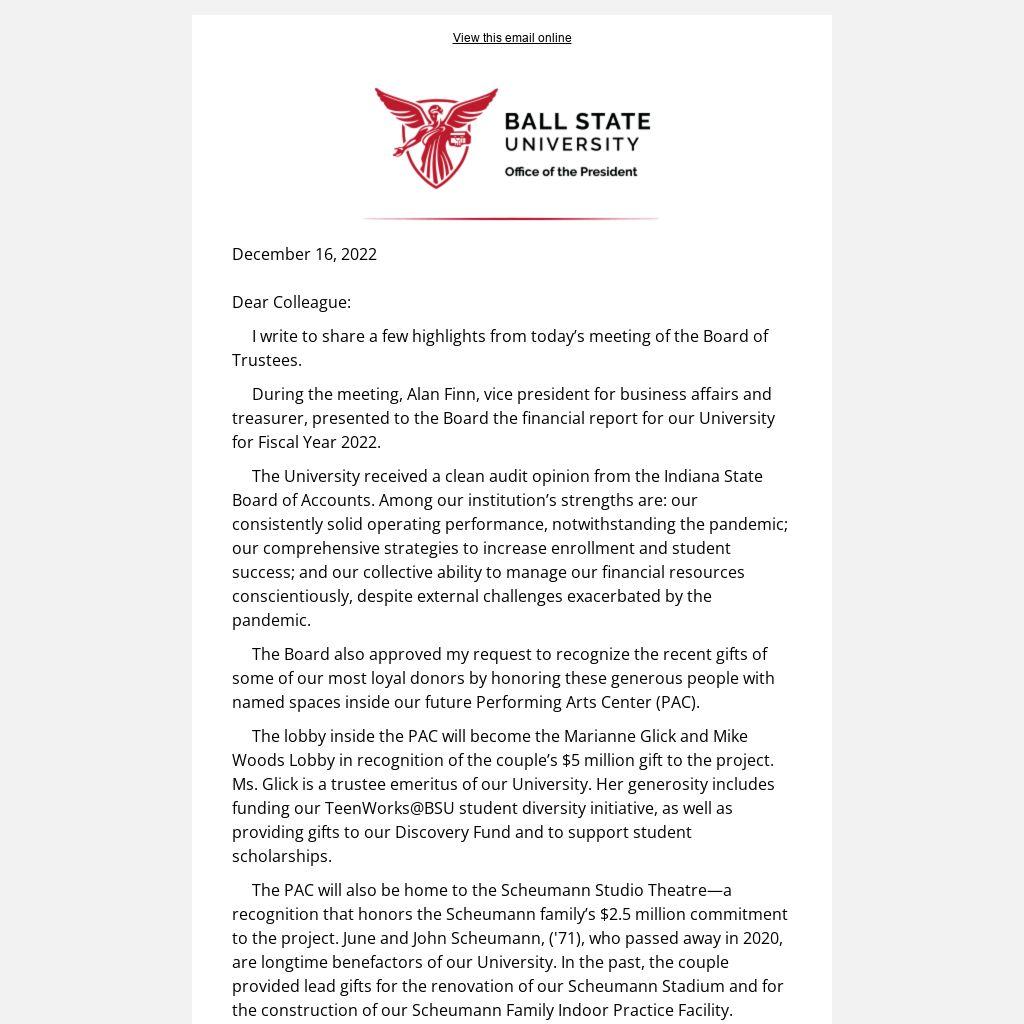 Finally, the Board approved my recommendation to award an honorary doctor of laws degree to Dick Emens in recognition of his extraordinary contributions to our University and his family’s remarkable legacy at our institution. Dick is the son of Dr. John R. Emens, who served as the sixth president of Ball State from 1945 to 1968.