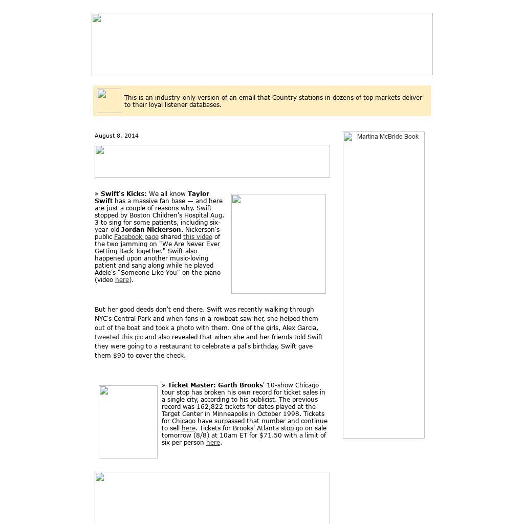 Birthdays Friday (8/8): Mark Wills, Phil Balsley (Statler Bros.), Jamie O’Hara, Mel Tillis, Michael Johnson, the late Webb Pierce. Saturday (8/9): the late Merle Kilgore. Sunday (8/10): Gene Johnson (Diamond Rio), Jennifer Hanson, Lydia Salnikova (formerly of Bering Strait), the late Jimmy Dean. Monday (8/11): John Conlee, Rachel Proctor, Alexander "Sasha" Ostrovsky (formerly of Bering Strait). On TV Friday (8/8): Luke Bryan, Good Morning America (ABC). Sunday (8/10): 2014 Teen Choice Awards (FOX), Brad Paisley, Rising Star (ABC). Monday (8/11): LeAnn Rimes and Eddie Cibrian, The Wendy Williams Show (syndicated), Dwight Yoakam, Under The Dome (CBS). Upcoming Album Releases Aug. 19 Various Nashville Outlaws: A Tribute To Mötley Crüe Chase Rice Ignite The Night Randy Travis Influence Vol. 2: The Man I Am Various Look Again To The Wind: Johnny Cash's Bitter Tears Revisited Joel Crouse Even The River Runs Sarah Dunn Band You Or The Whiskey Aug. 25 Brad Paisley Moonshine In The Trunk Aug. 25 Brushville Self-Titled Lenny Cooper The Grind (BackRoad/Average Joes) Sep. 2 Terri Clark Some Songs Sep. 9 Lee Brice I Don't Dance (Curb) Dustin Lynch Where It's At (Broken Bow) Sep. 16 Tim McGraw Sundown Heaven Town (Big Machine) Sep. 23 Kenny Chesney The Big Revival (Blue Chair Bay/Columbia) Lee Ann Womack The Way I'm Livin' (Sugar Hill) Big & Rich Gravity (Big & Rich/Kobalt) Sep. 30 Lady Antebellum 747 (Capitol) Blake Shelton Bringing Back The Sunshine (Warner Bros.) Marty Stuart Saturday Night & Sunday Morning (Superlatone) Oct. 21 Little Big Town Pain Killer (Capitol) Oct. 28 Stoney Larue Aviator (eOne) Nov. 4 The Doobie Brothers Southbound (Arista) |