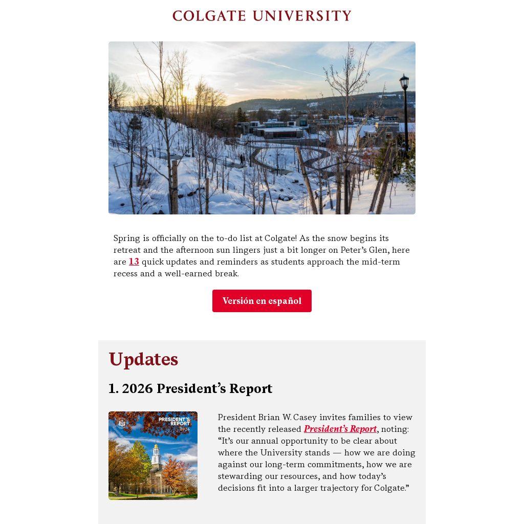 Spring is officially on the to-do list at Colgate! As the snow begins its retreat and the afternoon sun lingers just a bit longer on Peter’s Glen, here are 13 quick updates and reminders as students approach the mid-term recess and a well-earned break.