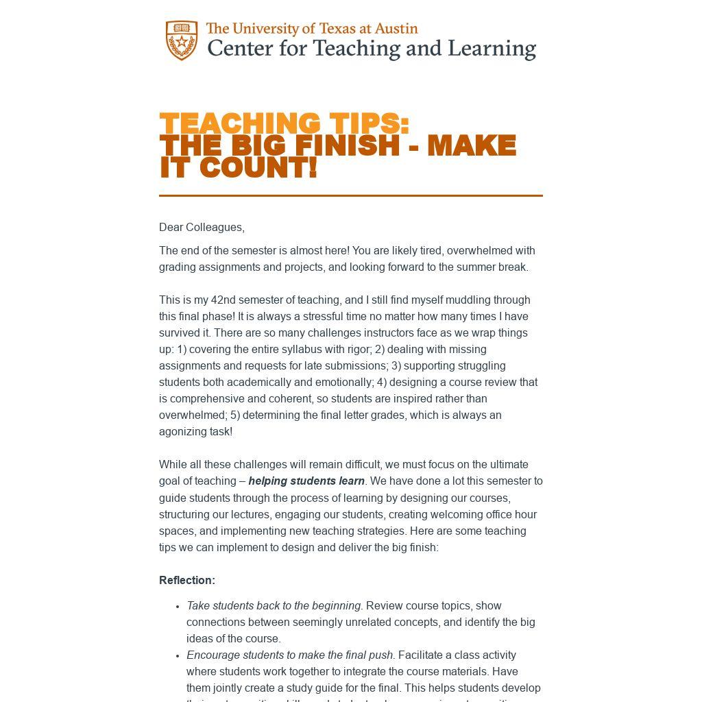 While all these challenges will remain difficult, we must focus on the ultimate goal of teaching – helping students learn. We have done a lot this semester to guide students through the process of learning by designing our courses, structuring our lectures, engaging our students, creating welcoming office hour spaces, and implementing new teaching strategies. Here are some teaching tips we can implement to design and deliver the big finish: