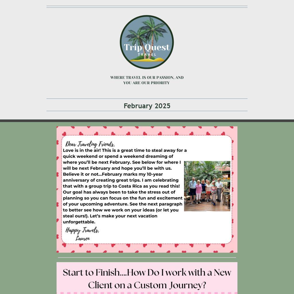 I am Lauren Williams, owner of Trip Quest Travel Services for the past ten years. Moving from three decades in education to becoming a travel consultant has caused me to shift from “The Doctor of Education” to “The Doctor of Travel.” My clients are often just like me – they want a rejuvenating vacation that teaches them about the world and the cultures around them. I love beautiful scenery, exploring new places, and learning something new every day! Aside from travel, I stay busy with my husband, Steve, who has joined me in the travel business, and our four children and thirteen grandchildren. Being active in the church and in our community feeds our souls as well. I love to play pickleball and bridge when I am not helping clients plan that perfect trip! Because our world is so much smaller now, I am happy to work with clients wherever they might live…but by referral only. Let me know if you have friends or family who would like to be added to my monthly newsletter list! Also, let me know if there is something you’d like to know more about!