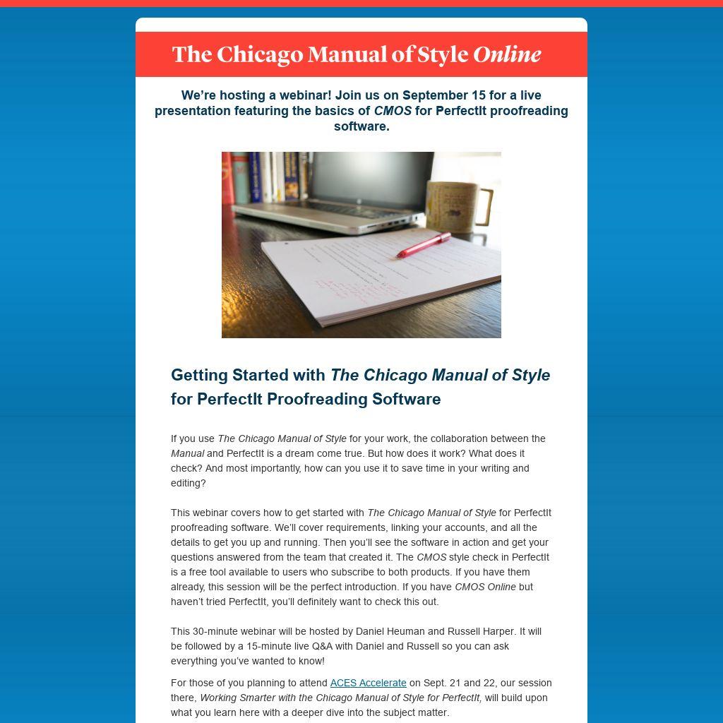 This webinar covers how to get started with The Chicago Manual of Style for PerfectIt proofreading software. We’ll cover requirements, linking your accounts, and all the details to get you up and running. Then you’ll see the software in action and get your questions answered from the team that created it. The CMOS style check in PerfectIt is a free tool available to users who subscribe to both products. If you have them already, this session will be the perfect introduction. If you have CMOS Online but haven’t tried PerfectIt, you’ll definitely want to check this out.