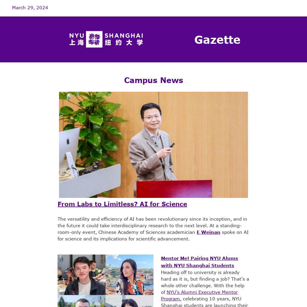 For a complete listing of events at NYU Shanghai, check out the Weekly Events Newsletter, delivered to your inbox every Monday when school is in session. If you wish to highlight your event in the Weekly Events Newsletter, upload your event to Engage no later than the Thursday before the Monday newsletter.