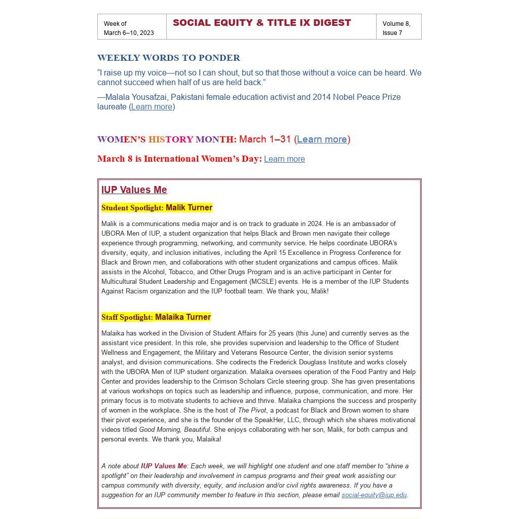 Digest issues are emailed every Monday morning. Send all information concerning your event to social-equity@iup.edu, and we will include it in the appropriate weekly issue. Also, please be sure to enter your event in the CMS on the DIVERSITY, STUDENT, and CENTRAL CALENDARS so that it will receive wider marketing, appear in IUP Now, and achieve greater attendance.