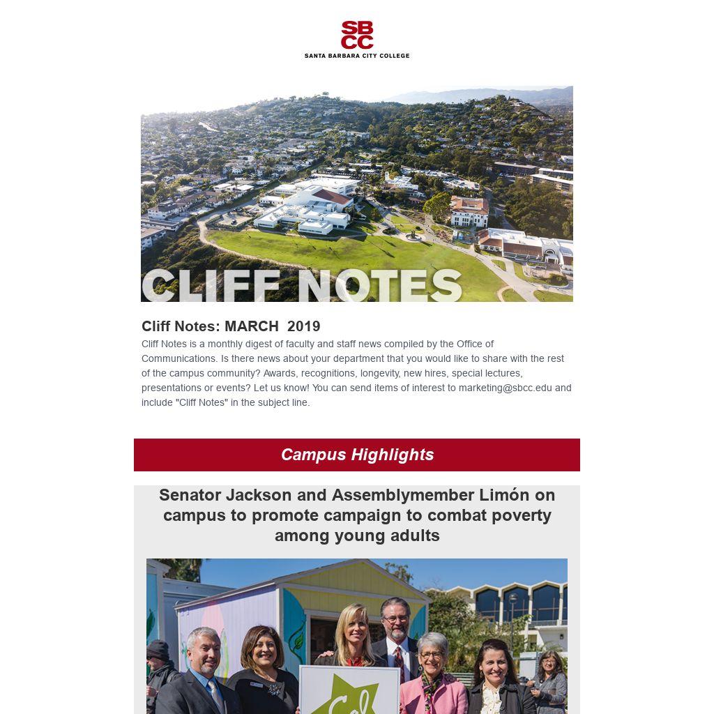 Cliff Notes: MARCH 2019Cliff Notes is a monthly digest of faculty and staff news compiled by the Office of Communications. Is there news about your department that you would like to share with the rest of the campus community? Awards, recognitions, longevity, new hires, special lectures, presentations or events? Let us know! You can send items of interest to marketing@sbcc.edu and include "Cliff Notes" in the subject line.