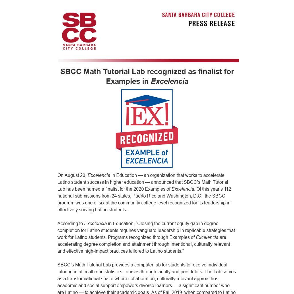 Examples of Excelencia will feature the Math Tutorial Lab program in their 2020 “What Works for Latino Students in Higher Education Compendium: Growing What Works” database — the only national online, searchable database — to promote effective institutional practices for Latino students. Inclusion in that database provides SBCC the opportunity to showcase the Math Tutorial Lab program to a national audience dedicated to Latino student success.