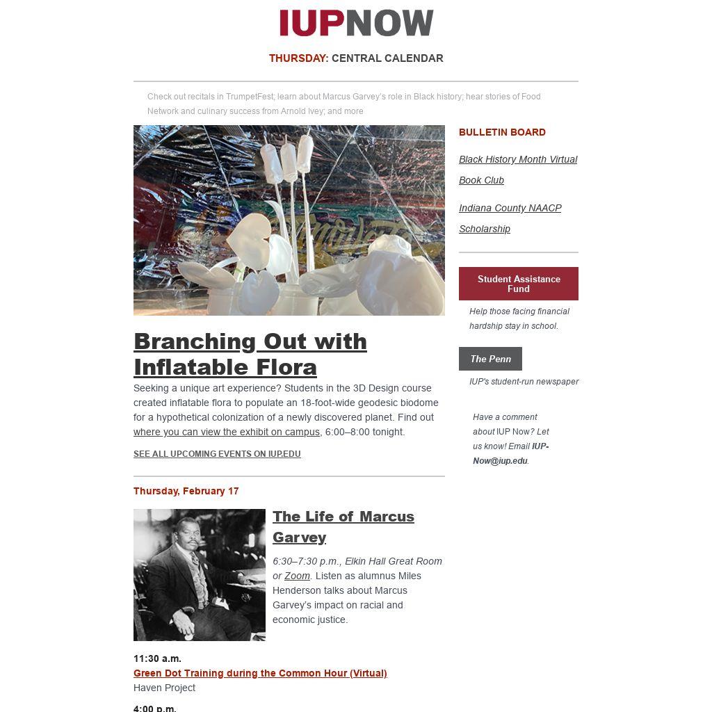 Distributed to IUP employees and students three days a week, IUP Now is the official newsletter of Indiana University of Pennsylvania. It features news from across the IUP website, compiled by the Division of Marketing and Communications. Find out how to get your news and events in IUP Now.