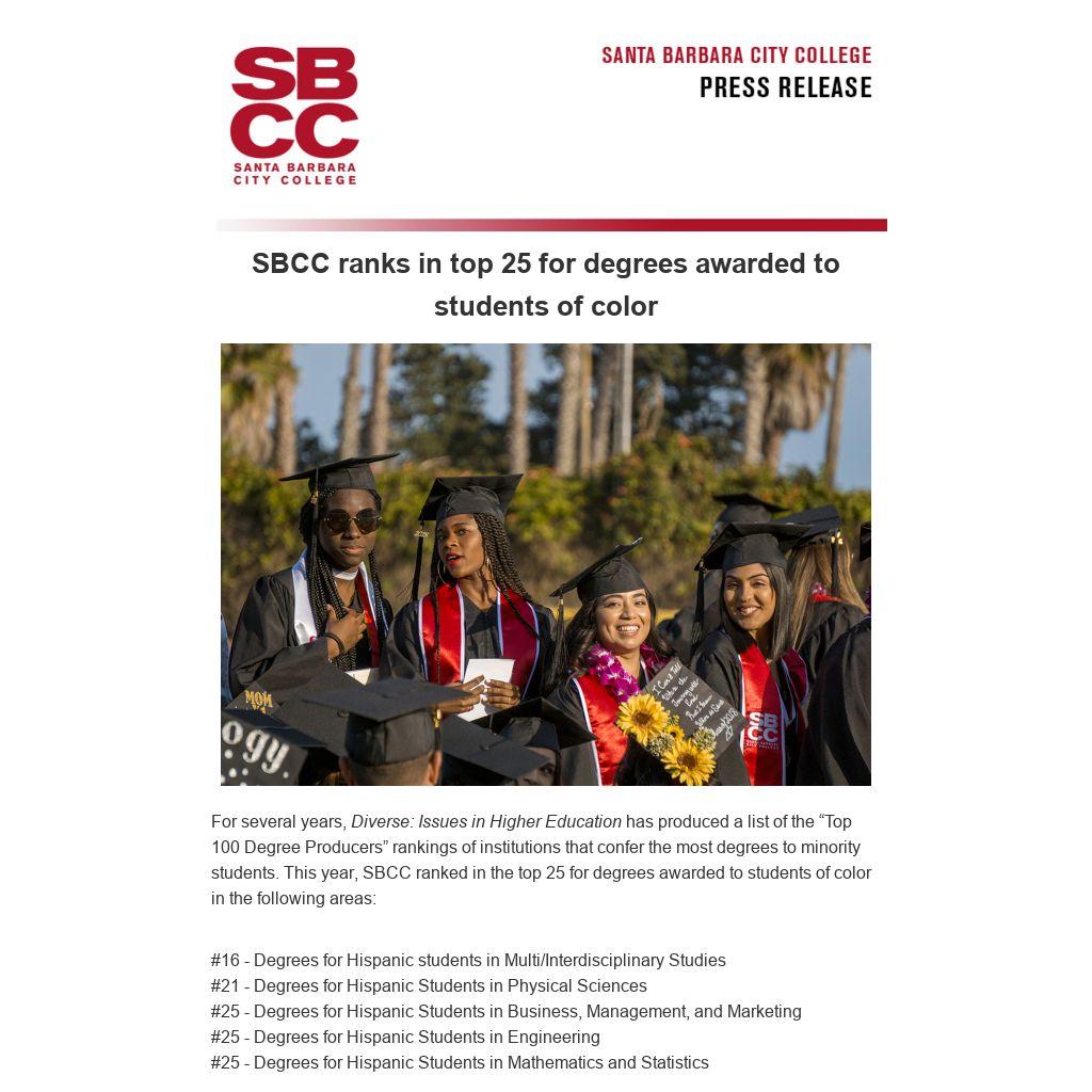 For several years, Diverse: Issues in Higher Education has produced a list of the “Top 100 Degree Producers” rankings of institutions that confer the most degrees to minority students. This year, SBCC ranked in the top 25 for degrees awarded to students of color in the following areas:
