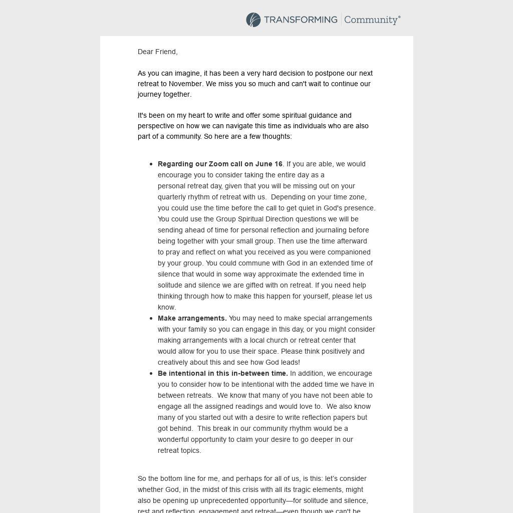 - Regarding our Zoom call on June 16. If you are able, we would encourage you to consider taking the entire day as a personal retreat day, given that you will be missing out on your quarterly rhythm of retreat with us. Depending on your time zone, you could use the time before the call to get quiet in God's presence. You could use the Group Spiritual Direction questions we will be sending ahead of time for personal reflection and journaling before being together with your small group. Then use the time afterward to pray and reflect on what you received as you were companioned by your group. You could commune with God in an extended time of silence that would in some way approximate the extended time in solitude and silence we are gifted with on retreat. If you need help thinking through how to make this happen for yourself, please let us know.