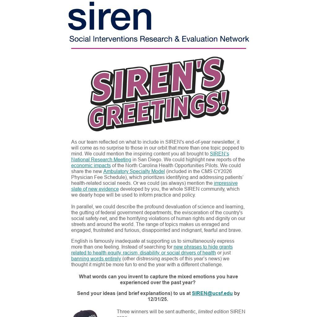 As our team reflected on what to include in SIREN's end-of-year newsletter, it will come as no surprise to those in our orbit that more than one topic popped to mind. We could mention the inspiring content you all brought to SIREN’s National Research Meeting in San Diego. We could highlight new reports of the economic impacts of the North Carolina Health Opportunities Pilots. We could share the new Ambulatory Specialty Model (included in the CMS CY2026 Physician Fee Schedule), which prioritizes identifying and addressing patients’ health-related social needs. Or we could (as always) mention the impressive slate of new evidence developed by you, the whole SIREN community, which we dearly hope will be used to inform practice and policy.