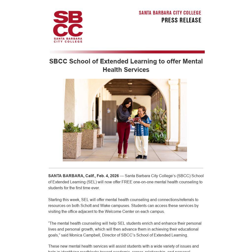 SANTA BARBARA, Calif., Feb. 4, 2026 Santa Barbara City College’s (SBCC) School of Extended Learning (SEL) will now offer FREE one-on-one mental health counseling to students for the first time ever.