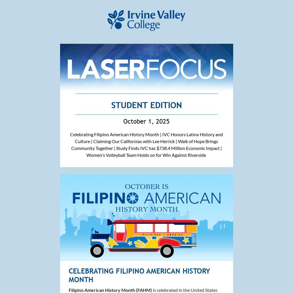 Celebrating Filipino American History Month | IVC Honors Latinx History and Culture | Claiming Our Californias with Lee Herrick | Walk of Hope Brings Community Together | Study Finds IVC has $738.4 Million Economic Impact | Women's Volleyball Team Holds on for Win Against Riverside