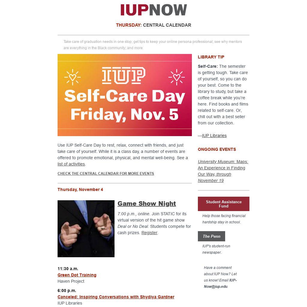 Distributed to IUP employees and students three days a week, IUP Now is the official newsletter of Indiana University of Pennsylvania. It features news from across the IUP website, compiled by the Division of Marketing and Communications. Find out how to get your news and events in IUP Now.