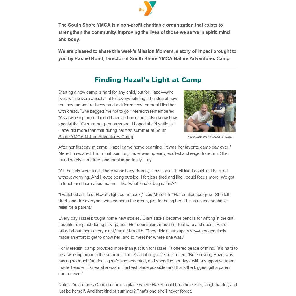 Every day Hazel brought home new stories. Giant sticks became pencils for writing in the dirt. Laughter rang out during silly games. Her counselors made her feel safe and seen. “Hazel talked about them every night,” said Meredith. “They didn’t just supervise—they genuinely made an effort to get to know her, and to meet her where she was.”