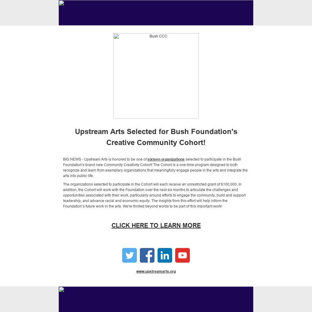 BIG NEWS - Upstream Arts is honored to be one of sixteen organizations selected to participate in the Bush Foundation's brand new Community Creativity Cohort! The Cohort is a one-time program designed to both recognize and learn from exemplary organizations that meaningfully engage people in the arts and integrate the arts into public life. The organizations selected to participate in the Cohort will each receive an unrestricted grant of $100,000. In addition, the Cohort will work with the Foundation over the next six months to articulate the challenges and opportunities associated with their work, particularly around efforts to engage the community, build and support leadership, and advance racial and economic equity. The insights from this effort will help inform the Foundation’s future work in the arts. We're thrilled beyond words to be part of this important work!