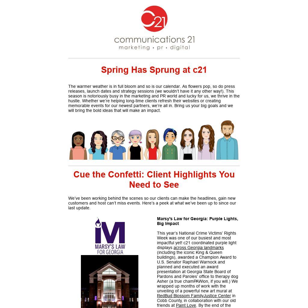 The warmer weather is in full bloom and so is our calendar. As flowers pop, so do press releases, launch dates and strategy sessions (we wouldn’t have it any other way!). This season is notoriously busy in the marketing and PR world and lucky for us, we thrive in the hustle. Whether we’re helping long-time clients refresh their websites or creating memorable events for our newest partners, we’re all in. Bring us your big goals and we will bring the bold ideas that will make an impact.