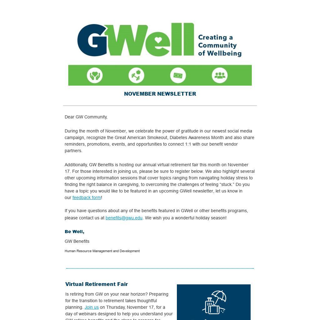 Additionally, GW Benefits is hosting our annual virtual retirement fair this month on November 17. For those interested in joining us, please be sure to register below. We also highlight several other upcoming information sessions that cover topics ranging from navigating holiday stress to finding the right balance in caregiving, to overcoming the challenges of feeling “stuck.” Do you have a topic you would like to be featured in an upcoming GWell newsletter, let us know in our feedback form!
