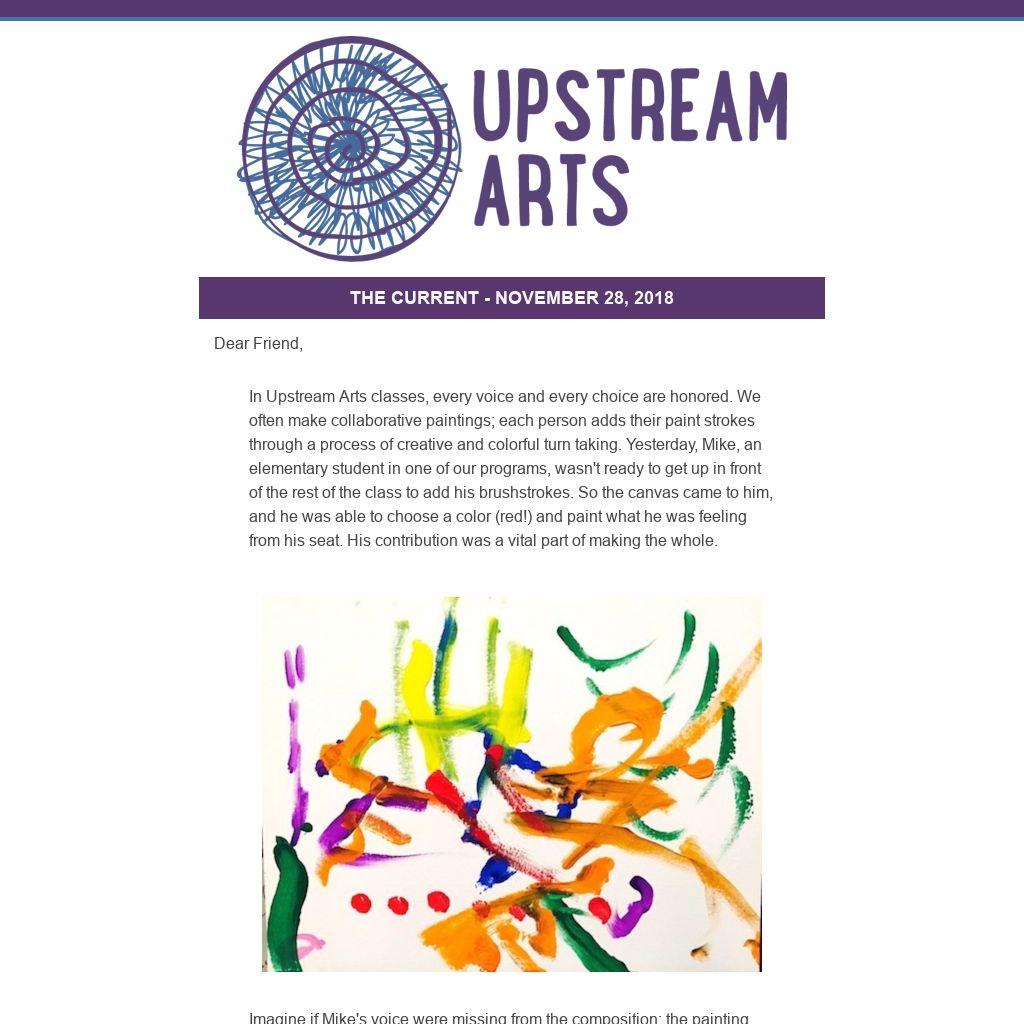 In Upstream Arts classes, every voice and every choice are honored. We often make collaborative paintings; each person adds their paint strokes through a process of creative and colorful turn taking. Yesterday, Mike, an elementary student in one of our programs, wasn't ready to get up in front of the rest of the class to add his brushstrokes. So the canvas came to him, and he was able to choose a color (red!) and paint what he was feeling from his seat. His contribution was a vital part of making the whole.