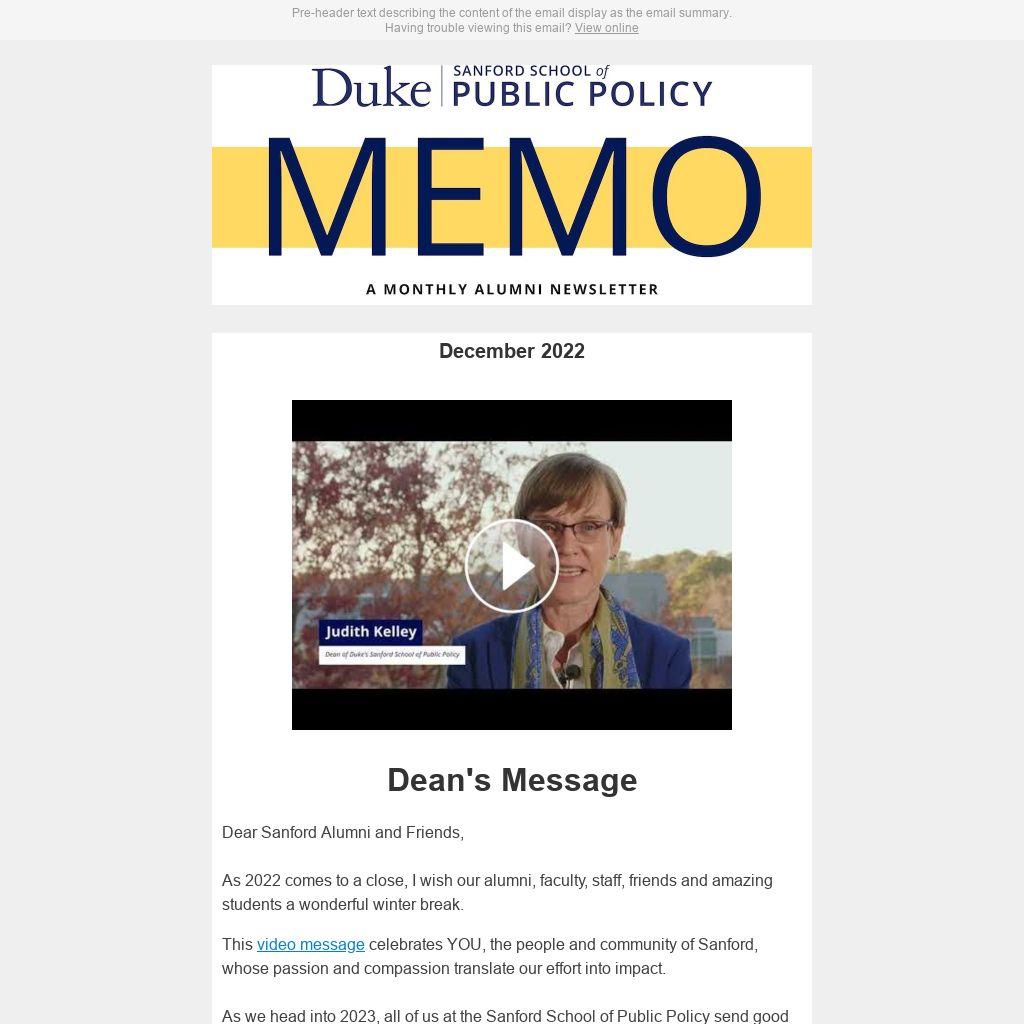 On behalf of the Sanford School of Public Policy, I wish you a wonderful holiday season and a very happy 2023.