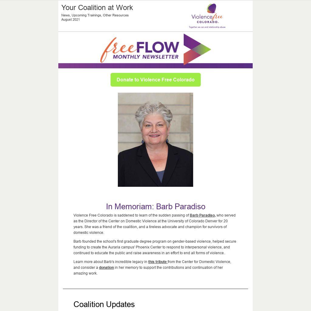 In Memoriam: Barb ParadisoViolence Free Colorado is saddened to learn of the sudden passing of Barb Paradiso, who served as the Director of the Center on Domestic Violence at the University of Colorado Denver for 20 years. She was a friend of the coalition, and a tireless advocate and champion for survivors of domestic violence.