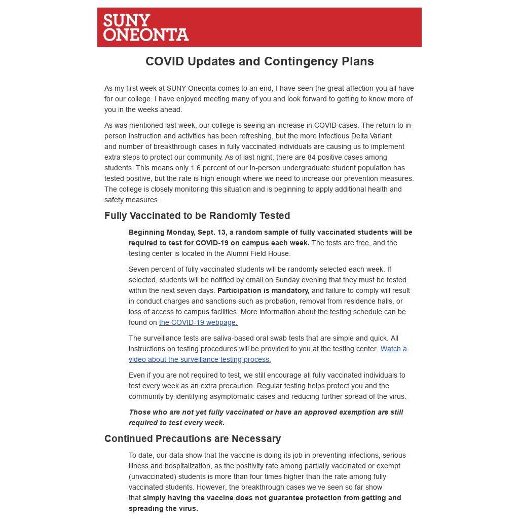 As was mentioned last week, our college is seeing an increase in COVID cases. The return to in-person instruction and activities has been refreshing, but the more infectious Delta Variant and number of breakthrough cases in fully vaccinated individuals are causing us to implement extra steps to protect our community. As of last night, there are 84 positive cases among students. This means only 1.6 percent of our in-person undergraduate student population has tested positive, but the rate is high enough where we need to increase our prevention measures. The college is closely monitoring this situation and is beginning to apply additional health and safety measures.