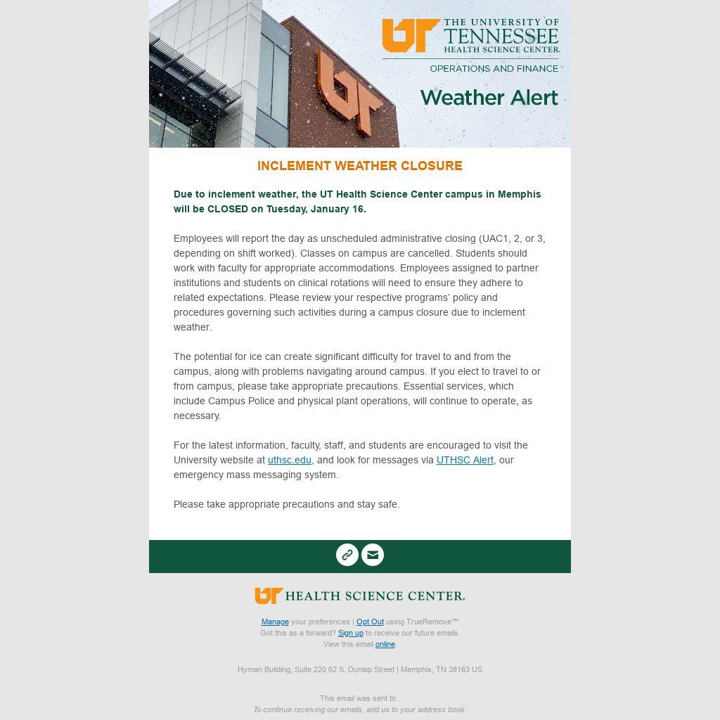 Due to inclement weather, the UT Health Science Center campus in Memphis will be CLOSED on Tuesday, January 16.
