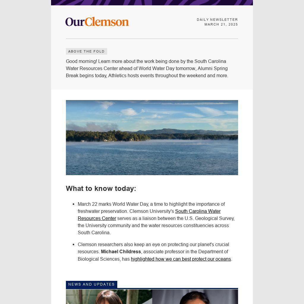 Good morning! Learn more about the work being done by the South Carolina Water Resources Center ahead of World Water Day tomorrow, Alumni Spring Break begins today, Athletics hosts events throughout the weekend and more.