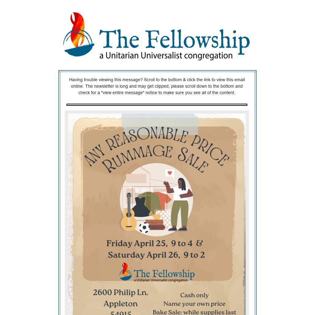 Our final fundraiser of the program year will be a rummage sale! The sale will be here at the Fellowship on Friday, April 25 (9:00 am - 4:00 pm) and Saturday, April 26 (9:00 am - 2:00 pm). Bring CASH to buy previously-loved treasures to support the Fellowship's programs. It is an "any reasonable price" sale so come ready to name your price! We'll also have a bake sale until the goodies run out.