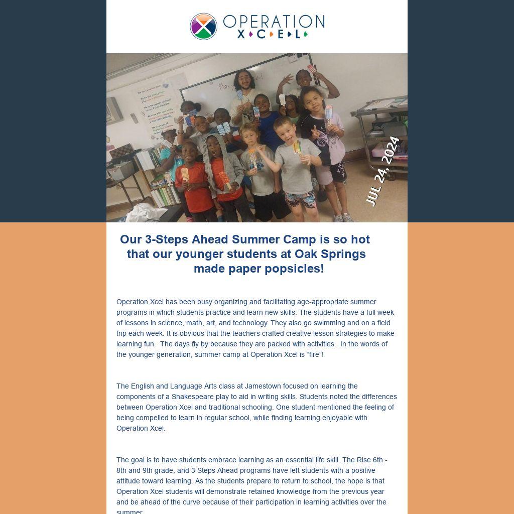The goal is to have students embrace learning as an essential life skill. The Rise 6th - 8th and 9th grade, and 3 Steps Ahead programs have left students with a positive attitude toward learning. As the students prepare to return to school, the hope is that Operation Xcel students will demonstrate retained knowledge from the previous year and be ahead of the curve because of their participation in learning activities over the summer.
