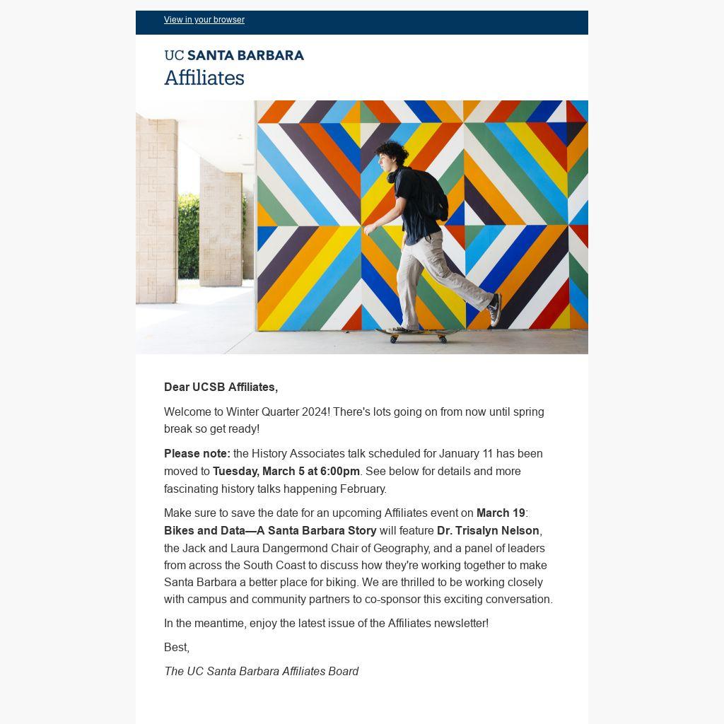Make sure to save the date for an upcoming Affiliates event on March 19: Bikes and Data—A Santa Barbara Story will feature Dr. Trisalyn Nelson, the Jack and Laura Dangermond Chair of Geography, and a panel of leaders from across the South Coast to discuss how they're working together to make Santa Barbara a better place for biking. We are thrilled to be working closely with campus and community partners to co-sponsor this exciting conversation.