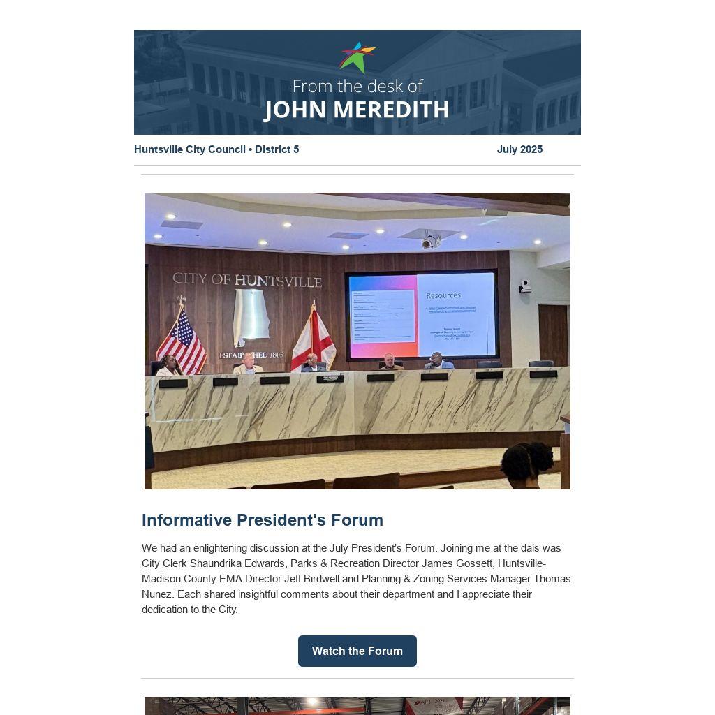 We had an enlightening discussion at the July President’s Forum. Joining me at the dais was City Clerk Shaundrika Edwards, Parks & Recreation Director James Gossett, Huntsville-Madison County EMA Director Jeff Birdwell and Planning & Zoning Services Manager Thomas Nunez. Each shared insightful comments about their department and I appreciate their dedication to the City.