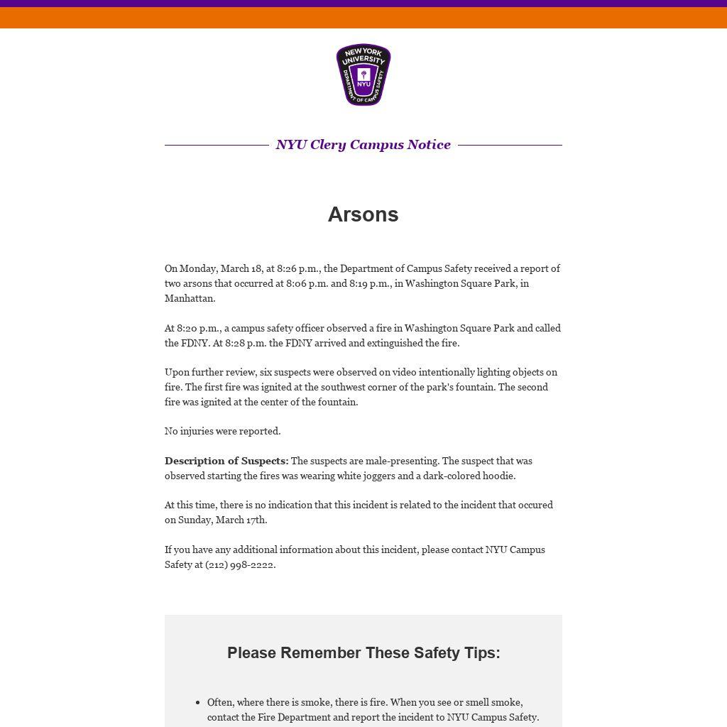 On Monday, March 18, at 8:26 p.m., the Department of Campus Safety received a report of two arsons that occurred at 8:06 p.m. and 8:19 p.m., in Washington Square Park, in Manhattan.