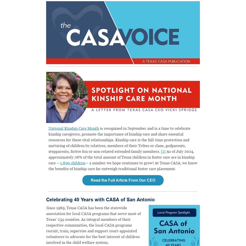 National Kinship Care Month is recognized in September and is a time to celebrate kinship caregivers, promote the importance of kinship care and share essential resources for these vital relationships. Kinship care is the full-time protection and nurturing of children by relatives, members of their Tribes or clans, godparents, stepparents, fictive kin or non-related extended family members. [1] As of July 2024, approximately 28% of the total amount of Texas children in foster care are in kinship care —5,890 children— a number we hope continues to grow! At Texas CASA, we know the benefits of kinship care far outweigh traditional foster care placement.