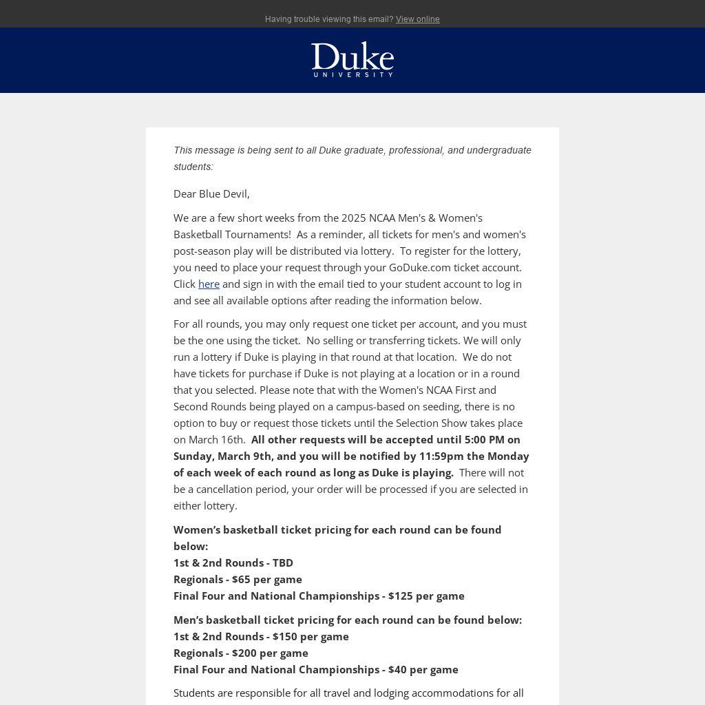 We are a few short weeks from the 2025 NCAA Men's & Women's Basketball Tournaments! As a reminder, all tickets for men's and women's post-season play will be distributed via lottery. To register for the lottery, you need to place your request through your GoDuke.com ticket account. Click here and sign in with the email tied to your student account to log in and see all available options after reading the information below.