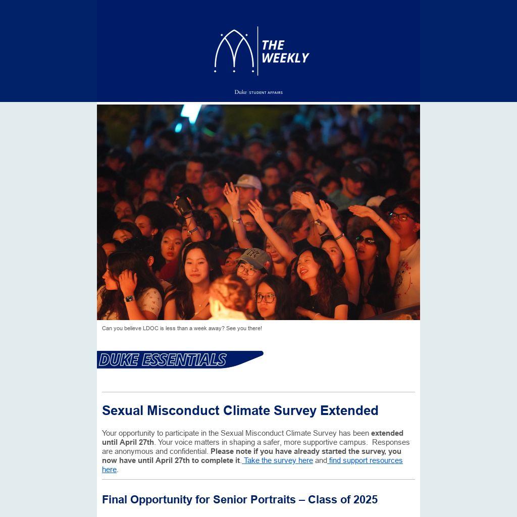 Your opportunity to participate in the Sexual Misconduct Climate Survey has been extended until April 27th. Your voice matters in shaping a safer, more supportive campus. Responses are anonymous and confidential. Please note if you have already started the survey, you now have until April 27th to complete it. Take the survey here and find support resources here.