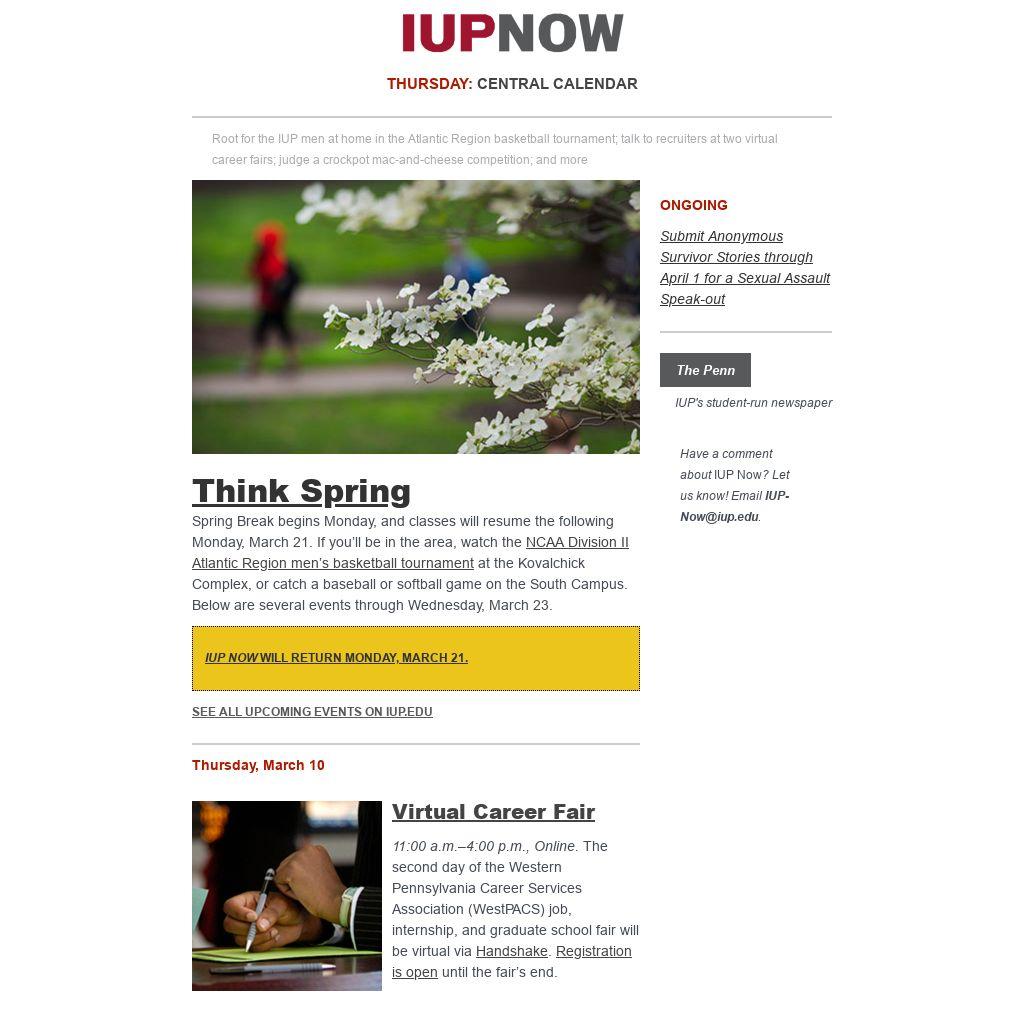 Distributed to IUP employees and students three days a week, IUP Now is the official newsletter of Indiana University of Pennsylvania. It features news from across the IUP website, compiled by the Division of Marketing and Communications. Find out how to get your news and events in IUP Now.