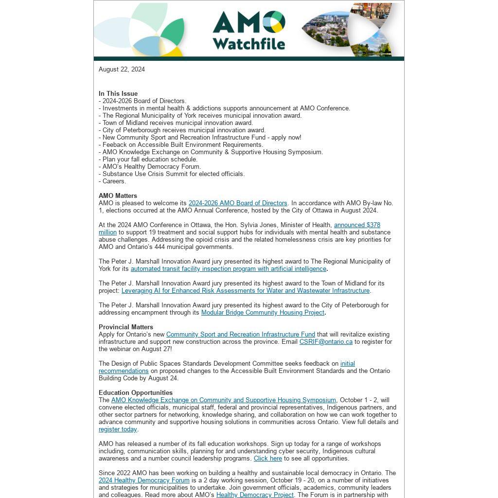 *Disclaimer: The Association of Municipalities of Ontario (AMO) is unable to provide any warranty regarding the accuracy or completeness of third-party submissions. Distribution of these items does not imply an endorsement of the views, information or services mentioned.