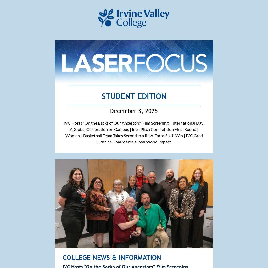 IVC Hosts "On the Backs of Our Ancestors" Film Screening | International Day: A Global Celebration on Campus | Idea Pitch Competition Final Round | Women's Basketball Team Takes Second in a Row, Earns Sixth Win | IVC Grad Kristine Chai Makes a Real World Impact